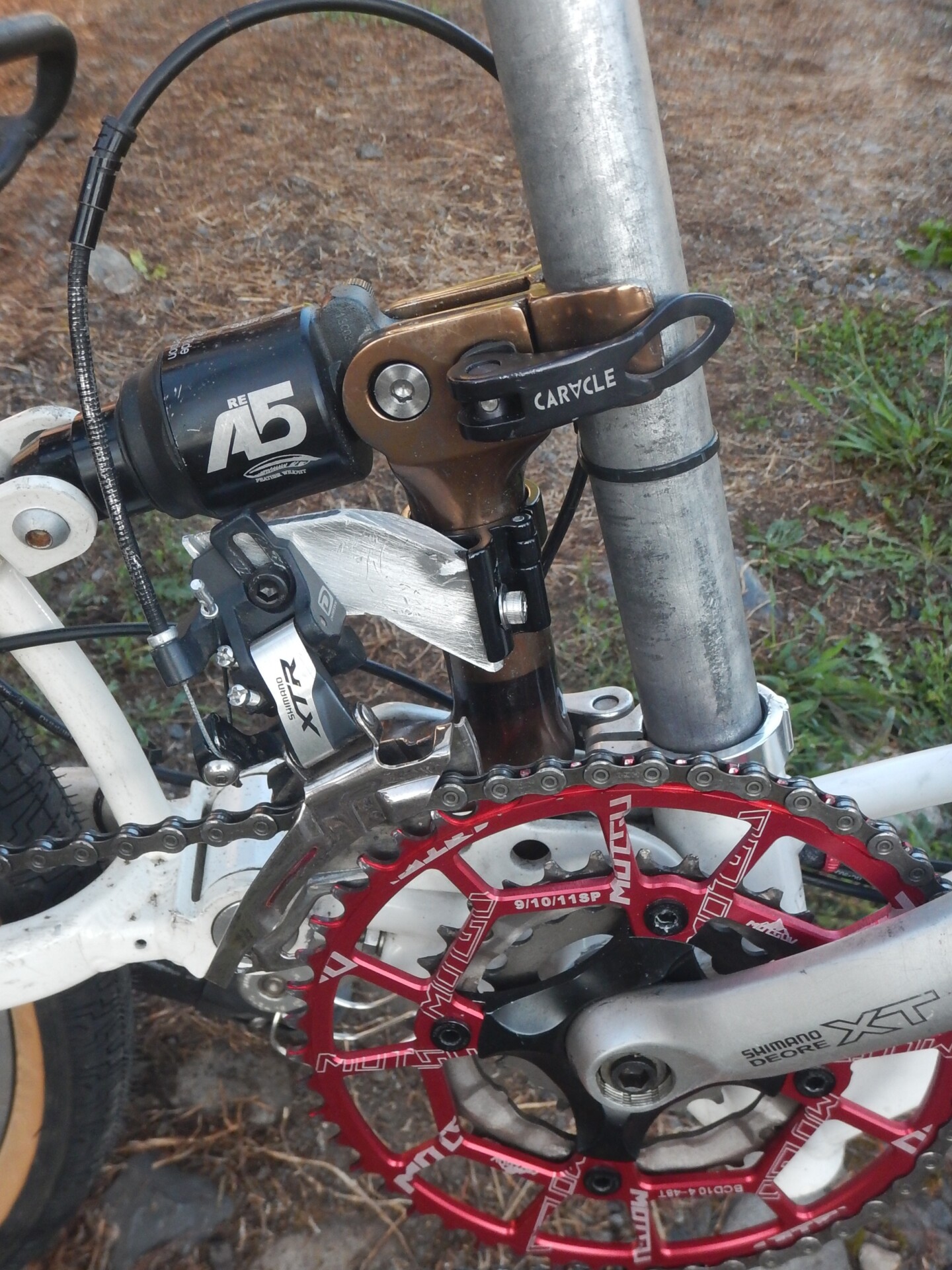 自分で削り出したオフセット金具を介して、先端をカットしたフロントディレイラーを装着し、フロントダブルと折りたたみを両立しているが、「良い子がマネをしたらどうするんですか」という、メーカーとしてはとてもマネできない仕様(笑)。ディスクブレーキ化もそれを想定した設計や検証を行っているわけではないので、メーカーとしてはお勧めできないが、いずれ純正ディスクブレーキモデルが登場することは間違いない。ただし、重量増やサイズ増大、そしてコストアップが避けられない。当分はリムブレーキモデルも併売することになるだろう。いずれにしても数年以上先の話だ。