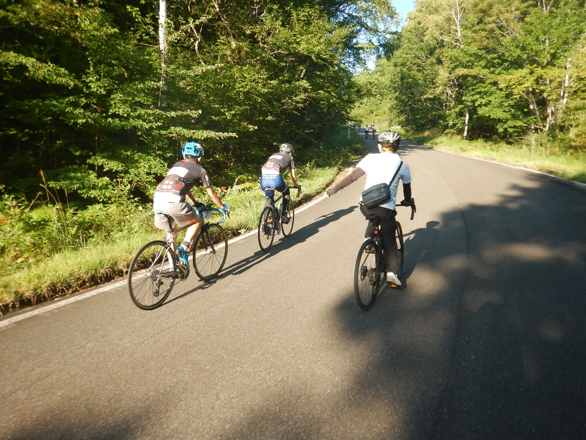 見送り組のうち4人で寿家さんに戻ることになり、珍しく自転車道を走ってみた。以前ちょっと走ってみたことがあるが、幅が狭く路面が荒れた箇所も多いため、もっぱら車道を走るようになっていた。上高地乗鞍スーパー林道と並走するルートから離れて東に向かうと、林間を下っていく自然豊かなルートで、後ろを走るS本さんの自転車を撮影すれば「そのままニューサイ(休刊となったNewCycling誌)の表紙に使えますね」なんて話していたが、暗い林間では明るさが足りずブレブレだった。
