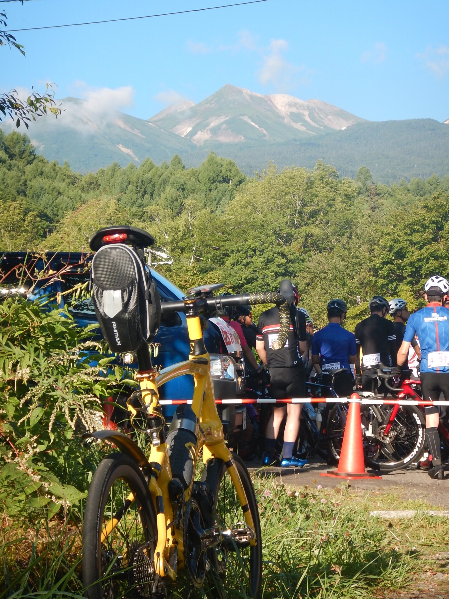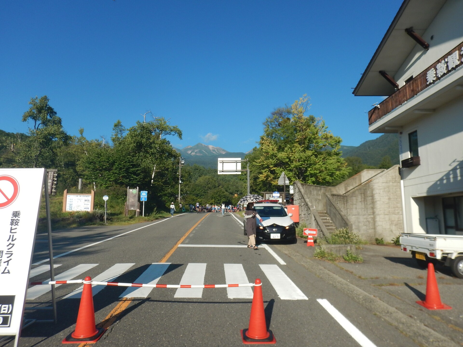 閉鎖されて今日の午前中は出場者専用の県道84号線(エコーライン)の向こうに乗鞍岳と、スタート時間の近い出場者が固まっているのが見える。