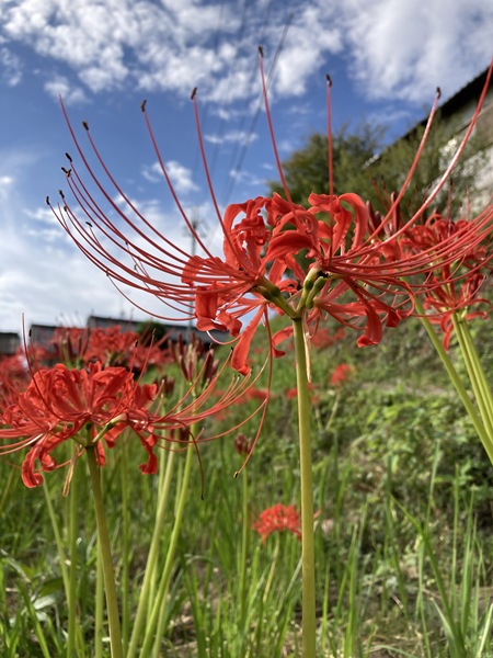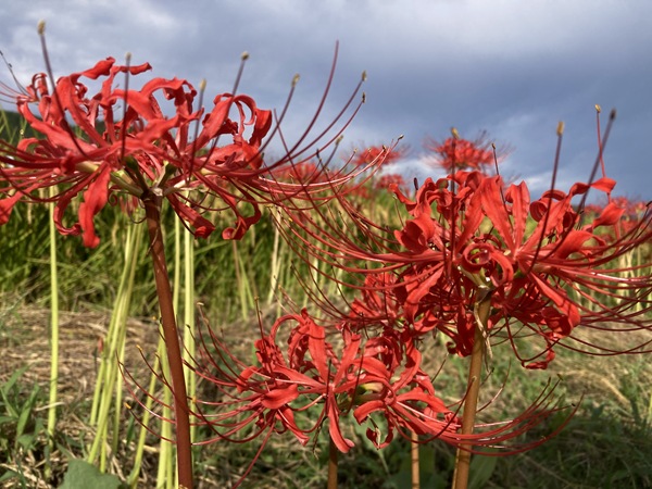 青空をバックにした赤い花が美しい。赤い絨毯のような群生を眺めていて句心が湧いた。すでに彼岸を過ぎてしまったがむしろこれからが盛りである彼岸花(曼珠沙華)の群生を句にしたかったが、彼岸と彼岸花(あるいは曼珠沙華)の両方を入れると季重なりになる。どちらかを別の表現にできないか考えたが、その場では浮かばず帰宅後に彼岸花(曼珠沙華)の群生を「田んぼのそばの赤い絨毯」→「田畔(たぐろ)の緋毛氈」に譬えることを思いつき、表題の「秋彼岸 過ぎて田畦の 緋毛氈」という句となった。相変わらずのヘボ俳句だが、ちょっと頑張った。それでも、温暖化で暦と花の盛りがすれていく憂いまで、伝えきれていないかもしれない。