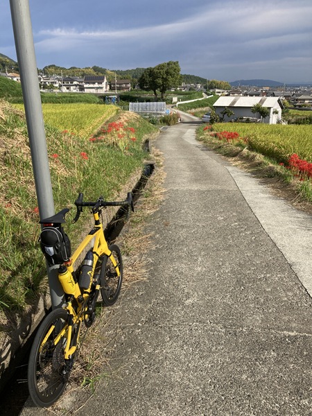 県道30号線は交通量が多いし、彼岸花(曼珠沙華)を細道を走ろうと、できるだけ山麓を南下していく。イトーピアの新興住宅地からは大和三山を見晴らす絶景と共に、稲穂の実る黄金田の畦に赤いものがちらほら見える。
