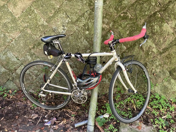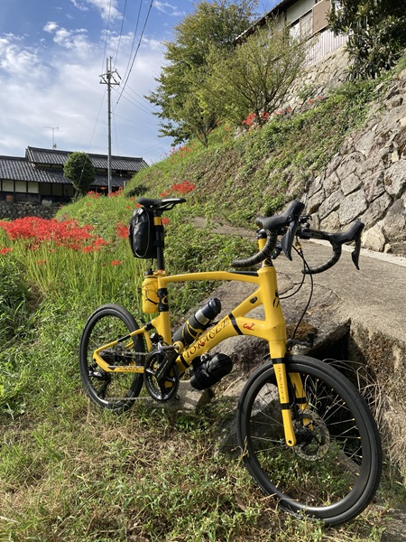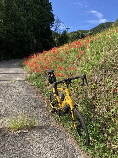 イトーピア住宅地の端で柵の向こうの道に彼岸花(曼珠沙華)が見え、細い急勾配の近道と遠回りの車道のどちらで彼岸花(曼珠沙華)に向かうか逡巡して減速しすぎてバランスを崩し、ビンディングペダルからシューズが外せず立ち転けしてしまった。ほぼ停止していたので外傷はひじの軽い擦り傷程度だったが、脇腹を打ちつけてしまった。身体をひねるような動きをすると痛む。TORACLE-COZ2に大きな損傷はなかったが、ブレーキレバーとリアディレイラーに傷が増えてしまった。全くアホらしいコケ方をしてしまった。その後は大人しく少し車道を遠回りして彼岸花(曼珠沙華)のそばにやってきた。まだこの辺りの群生はまだ控えめで、溝の向こうなので近寄ることもできなかった。まだつぼみも多く、来週辺りが一番の見頃かもしれない。