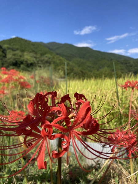 県道254号線は寺口地区で左折して東進していくが、そのまま直進していくと、田んぼの土手に彼岸花(曼珠沙華)が群生して赤とんぼが群れていた。秋らしい風景にほっこり。