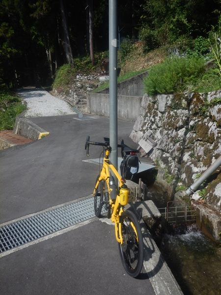 身体をひねると脇腹が痛むので、シッティング主体で大人しく旧道を上っていくが、涼しいせいか、カーボンリム化のおかげか、今までの印象より楽に上っていける。祈りの滝の入口にも数本の彼岸花(曼珠沙華)が咲いていたので、珍しく上りの途中で停まって撮影。名水として知られ、水汲み場が車や人でごった返している時期もあったが、今日は先客が一人いるだけで静かだった。
