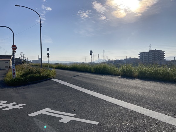 10時には松原に戻ろうと思っていたので、もう時間がない。最短距離で松原市中心部に向かうとチェックスポットであり八尾空港のそばを通過するが、チェックスポットは遠回りして空港内に入り込んだところにあるので、獲得は難しいと思っていた。ところが、かなり離れた地点でチェックスポットが近いとの通知があったので、空港外周道路にまで近寄ってみた。2.6km走って9:56。