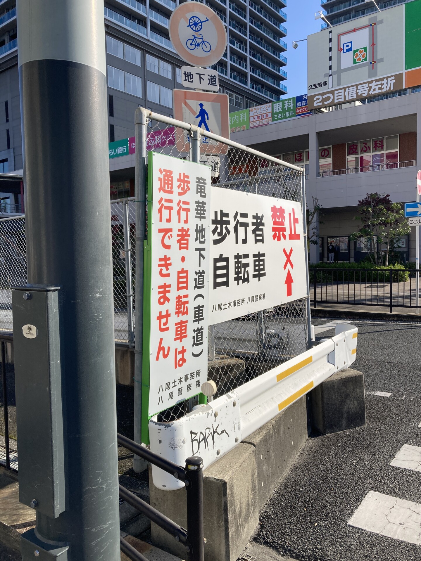 短い時間でどこを回るか悩ましく、ひとまず久宝寺緑地に向かおうと北上したが、JR久宝寺駅の下をくぐる地下道が閉鎖されていた。