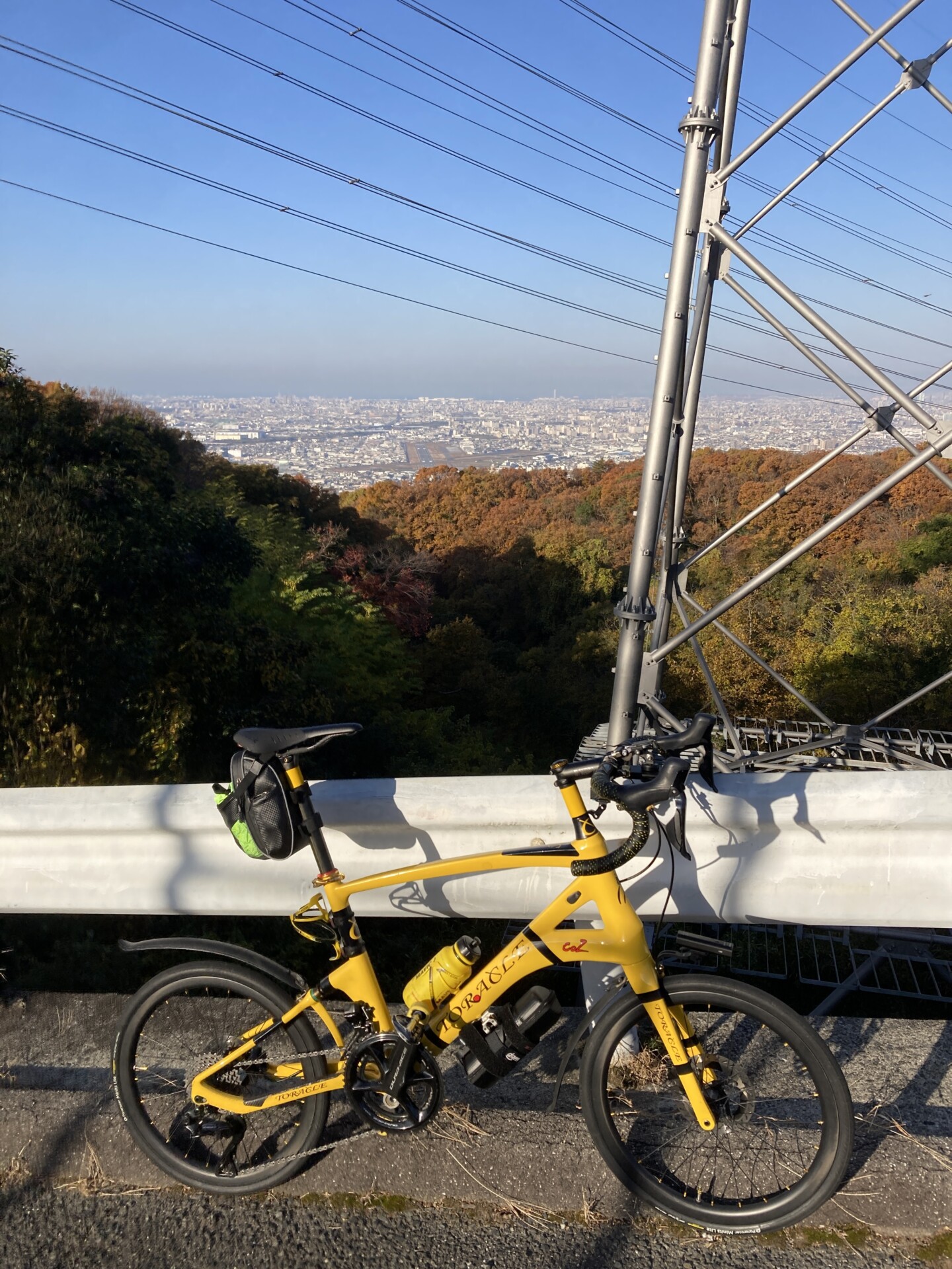 ここからさらに山を上っていき、仏舎利塔付近でぶどう坂を上るルートと合流して信貴山を目指す。変電所付近からは八尾空港を真正面に見下ろせる。雲のほとんどない青空の下の大阪平野が美しい。