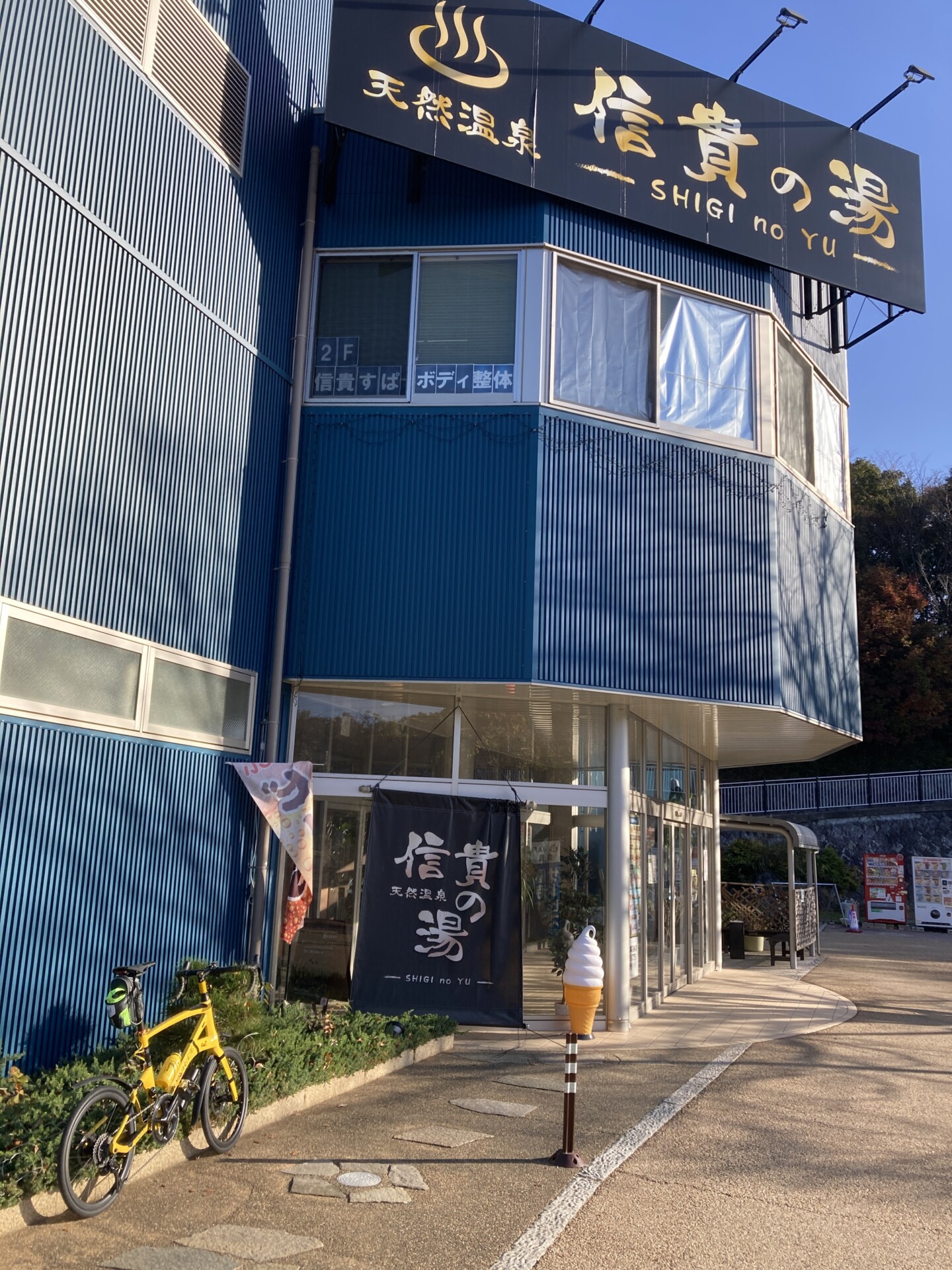 信貴山のどか村の有料エリアに囲まれているのでどこから入るのか少し迷ったが、700mほど走って8:42に信貴の湯に到着