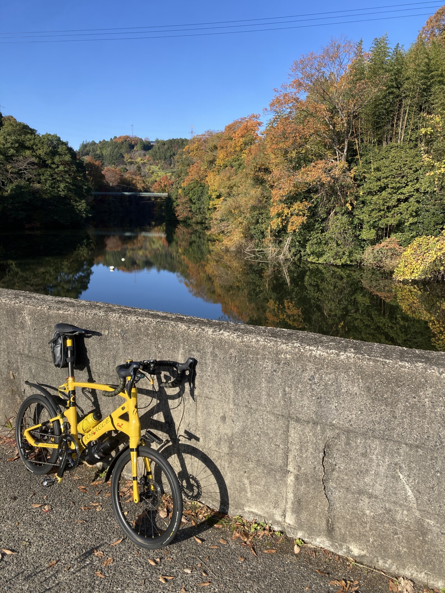 直滑降で信貴フラワーロードを下っていき、県道236号線に突き当たって左折するととっくりダムの堰堤からダム湖周辺の紅葉が青空と一緒に水面に映って美しい。気温は恐らく2~3°だが、風がほとんどないので日なたの寒さはまだマシだ。