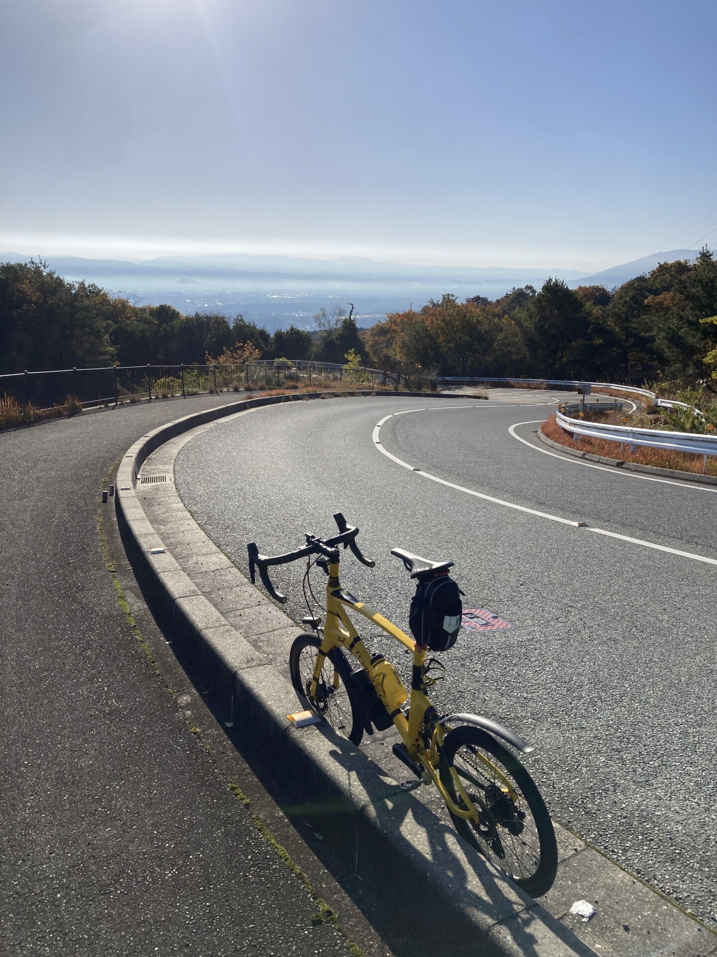 信貴フラワーロードの続きで山腹をアップダウンしながら横滑りしていき、県道250線を下っていく。これより北にある「奈良コース①」のチェックスポットはどうせ制覇できないので諦める。朝靄にかすむ奈良盆地が幻想的。
