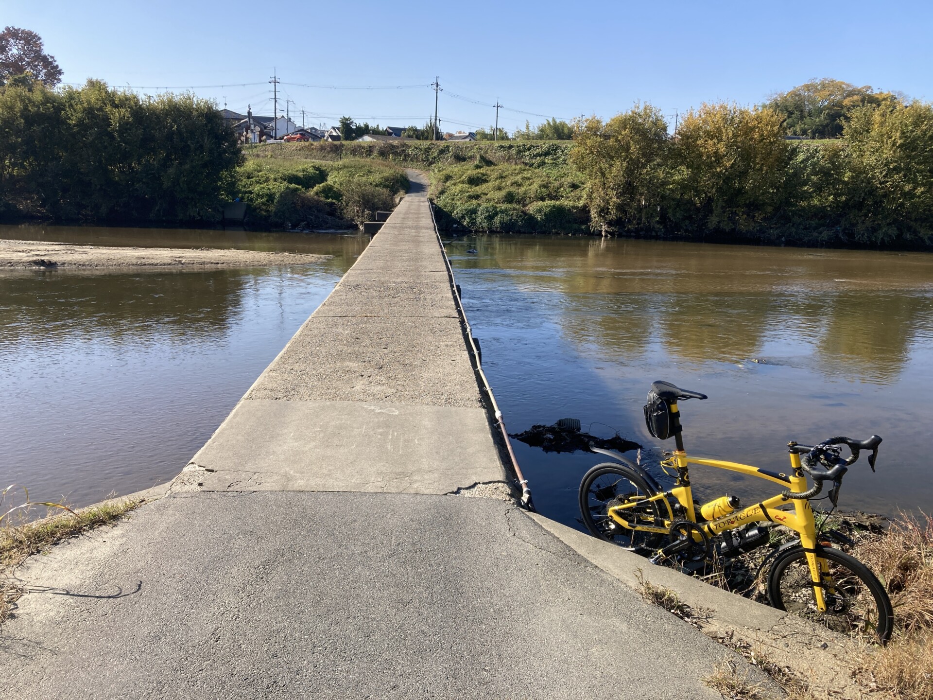 竜田川沿いに4.3km下り、10:10に大城橋(沈み橋・潜水橋)に到達。増水時には水面下に沈む欄干のない橋は四万十川で「沈下橋」と呼ばれているのが有名だが、奈良県にもある。河川行政用語としては、潜水橋が正式名称らしい。橋近辺に自転車を立てかける場所がなく、割と交通量が多いので、路上や橋上に自転車を置いて悠長に撮影もしてられない。