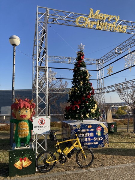 堰堤上には「大阪狭山イルミーネーション」の掲示とともに、クリスマスツリーや大阪狭山市のマスコットキャラクターさやりんが飾られていた。そういえば、さやりんは狭山池の龍神だったよな、と振り返ると……