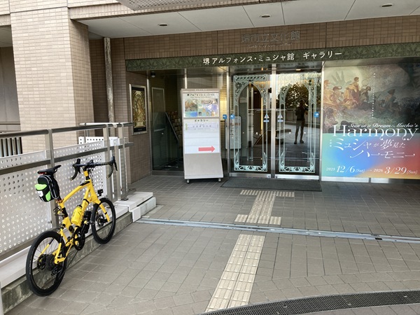 400m西に移動して、10:33に堺アルフォンス・ミュシャ館に到着。2階にあるのでTORACLE-COZ2を階段で担ぎ上げた。軽量なので盗難防止に施錠するよりてっとり早いし、施設前で撮影できる。