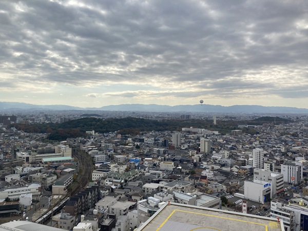 南西に3.3km走って堺東駅前の堺市役所にやって来た。時間が掛かるが自転車置き場に駐輪し、エレベーターで21階まで上がってMI-TEさかい(堺市役所21階展望ロビー)に10:56にやって来た。先ほど下から見上げた気球が仁徳天皇陵の向こうに浮かんでいるのが見える。ちょっと雲が増えてきたのが残念。