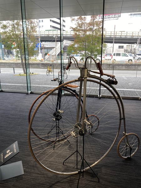 地上に戻り、1km弱北上してシマノ自転車博物館に11:05着。入館すると、オーディナリー(ダルマ型自転車)の向こうに駐輪したTORACLE-COZ2が見える。