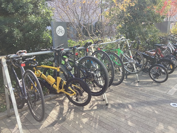 駐輪場にはスポーツバイクがずらり。これだけ並ぶのは珍しい。声を掛けそびれたが、中に入ると自転車乗りの一団が展示を見学していた。
