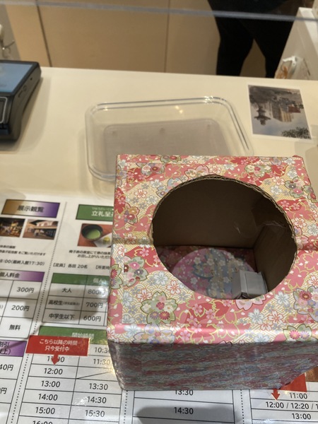 さかい利晶の杜が景品の受け渡し・抽選場所なので、カウンターのスタッフに申し出て、抽選箱のくじを引いた。