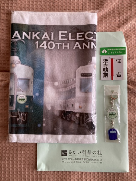 三角くじを開くと「わっ、すごい。1等です」と、景品(南海電鉄・阪堺電車のタオル、キーホルダー、ミニチュアマグネット)を頂いた。今シーズン初の大物当選は、世界・日本・堺の鉄道の歴史をたどる企画展の一環らしい景品だ。