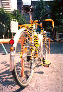 この「猛虎弐号」は1988年7月に作成した、初めてのオーダーフレーム。オーソドックスなランドナーフレームだが、右フォークにヤジロベー(トモダ製のライト用アタッチメント)をセットするダボを設けたり、輪行を容易にするためにディレーラーのプーリーをチェーンレストとして使用できる特別加工をしていた。ダブルボトル仕様にするためにポンプダボを右シートステーに設け、キャンピングキャリアとマッドガード用に各エンドに2個ずつ(計8個)のダボを設けた。
